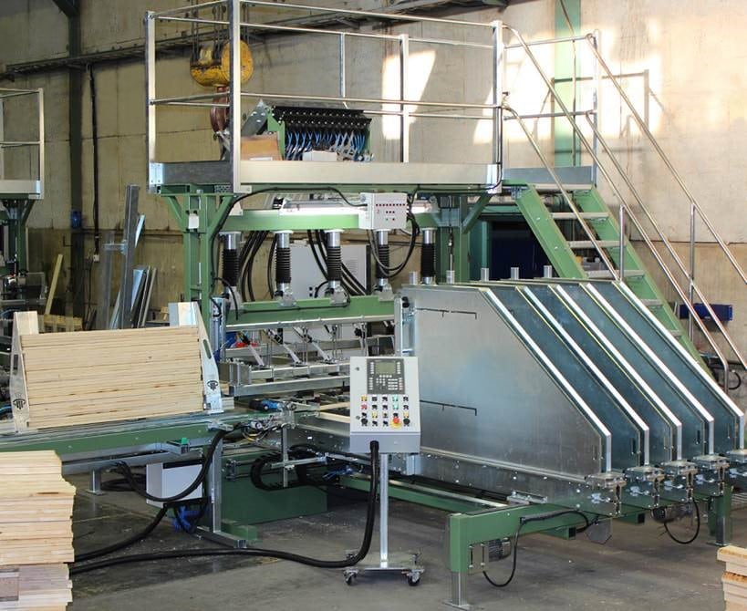 Two adjustable channels transport the stringer boards into the machine and position them accurately. The machine then nails the stringer boards to the underside of the stringer pallets.