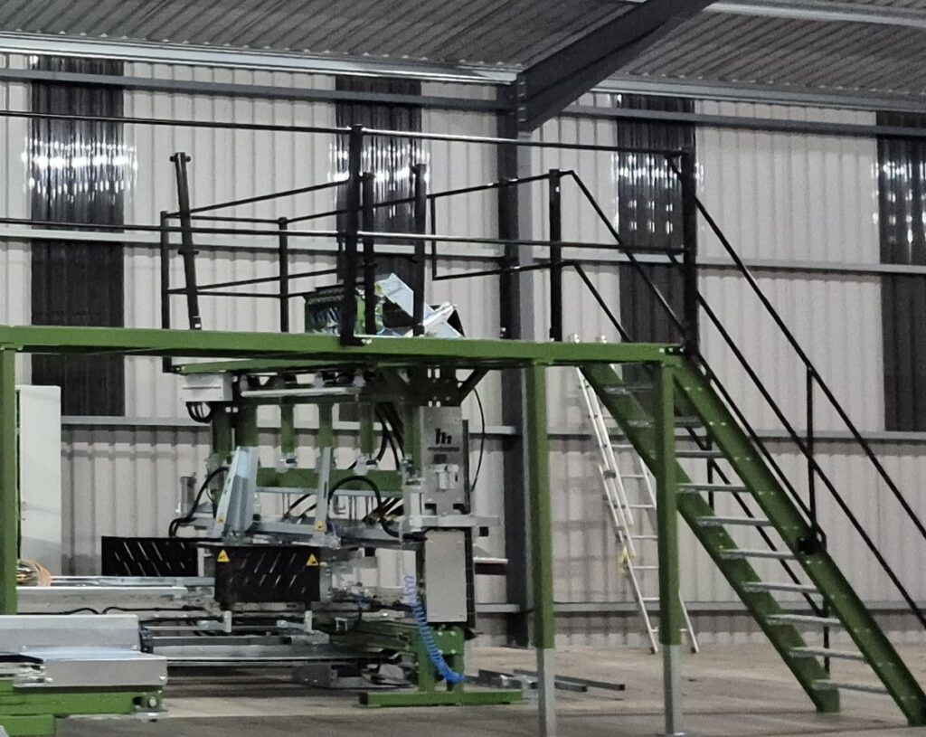 The UBM-2000 is designed to operate in line with the REM-2000 deck nailing machine. The decks are turned upside down by an additional unit, the FLP turner, and are automatically fed into the UBM-2000, where underboards are attached to the stringer boards.